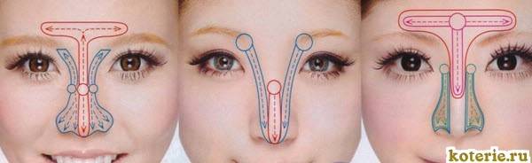 Визажисты предлагают и другой, не менее эффективный приём визуальной коррекции длины: тёмным корректирующим средством проводится линия, соединяющая веко с наружной частью спинки носа.