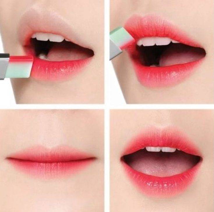 Любимая техника макияжа губ кореянок называется «градиент». Увлажненные губы следует покрыть тонким равномерным слоем консилера. Затем с помощью тонкой кисти или ватной палочки нужно нанести в центр губ немного цветного бальзама или тинта и слегка растушевать его, оставив края губ непрокрашенными. Их нужно покрыть другим оттенком тинта, бальзамом или блеском для губ.