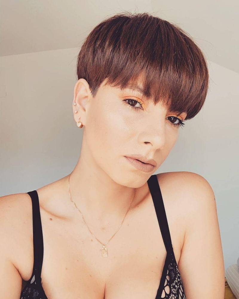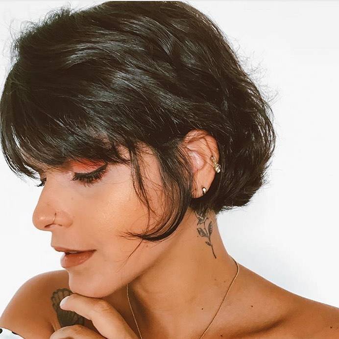 - Естественно, короткая челка отлично подойдет девушкам с короткими волосами. В этом случае традиционно смешивают стиль «пикси» (вариант короткой стрижки с открытми ушами и укороченной длиной сбоку и сзади) и ультракороткую челку.