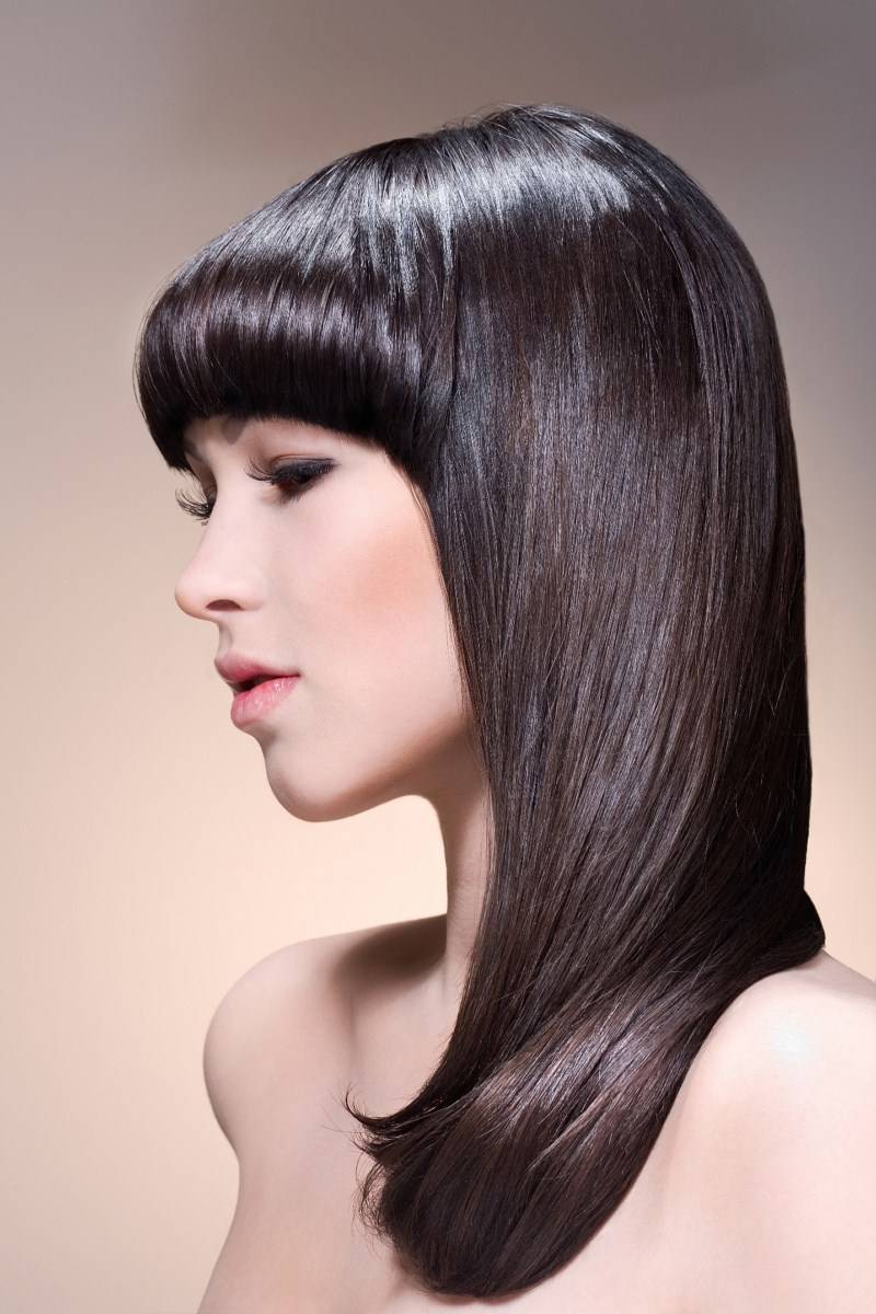 Прямая челка не подвергается филировке, так как требует четкой геометрии срезов. Она подходит к вытянутому овалу лица.