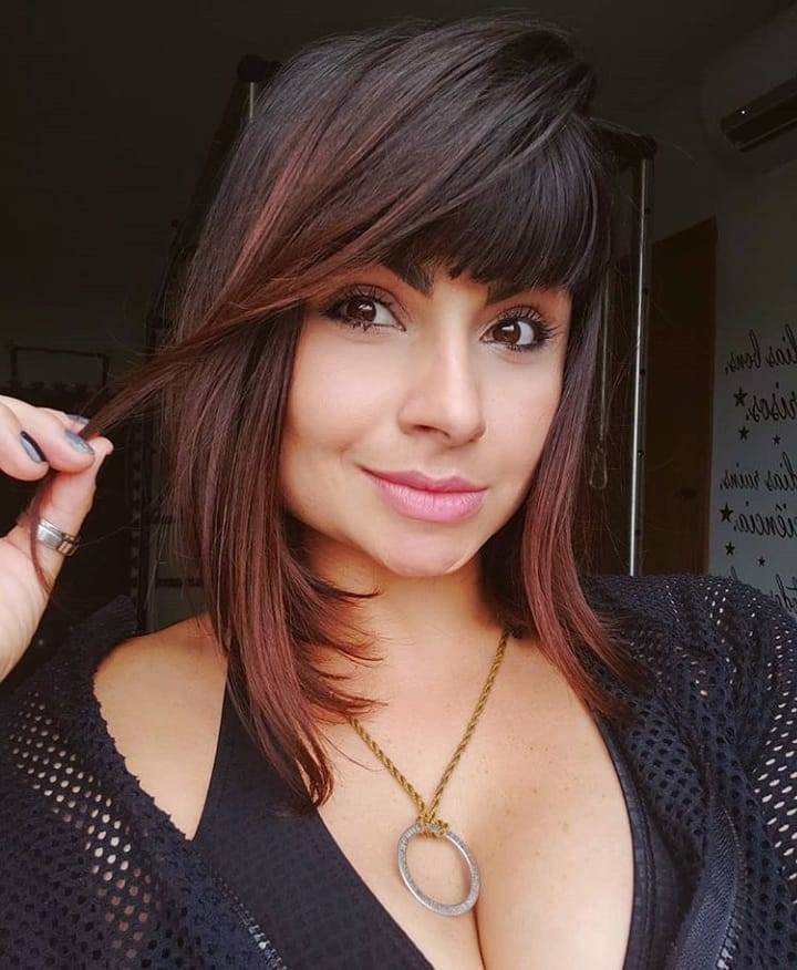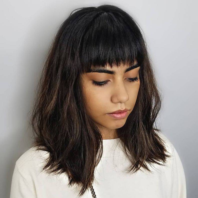 В сочетании с волосами средней длины чёлочка, подходящая к форме лица, всегда смотрится эффектно и стильно, практически вне зависимости от типа волос.