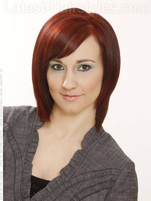 При локонах с длиной более средней делают короткие и длинные срезы, с прямыми и рваными краями, прямые, косые и набок. Всё зависит от типа волос и формы лицевого овала.