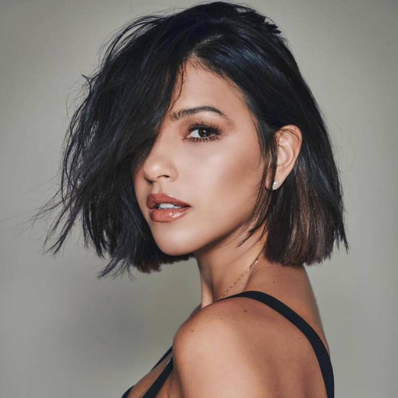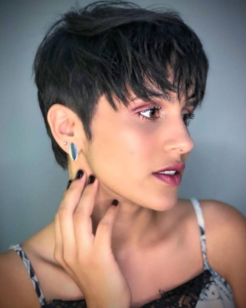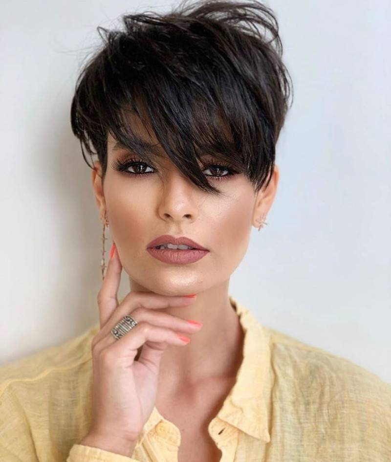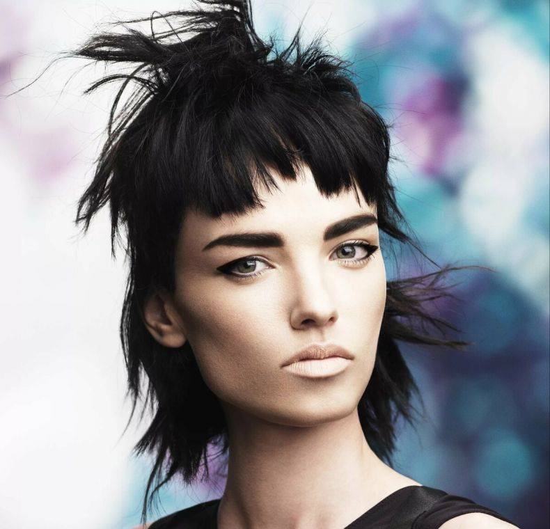 Короткая рваная челка обладает ярко выраженным антивозрастным эффектом, делает лицо выразительнее, а его черты мягче. Данный вариант прически лучше всего смотрится на темных волосах, ведь в таком случае ее текстура будет визуально более выражена.