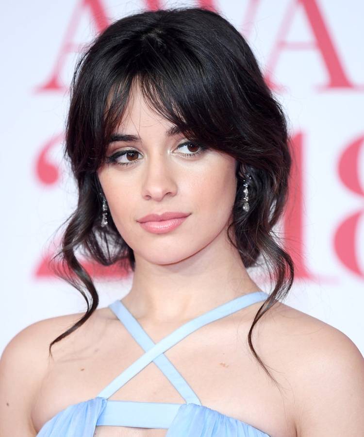 - Удлинённая чёлка, закрывающая брови, но не достигающая подбородка, подчёркивает красоту губ и делает более пропорциональными черты лица. Для укладки пользуются муссом или лаком, а при желании пряди можно зачесать назад.