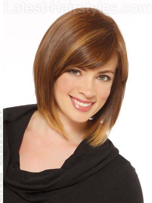 - Круглолицым предпочтительно избегать прямых линий. Им пойдут срезы с филированием, косые, рваные или дугообразные, а также очень длинная диагональная чёлка, спускающаяся ниже скул, со смещённым пробором. Это позволит визуально приблизить форму лица к овальной и сгладить слишком выпуклые круглые щёчки. Хорошо смотрится при круглой форме лица и короткий (до середины лба) овальный срез, а также многослойная чёлочка.