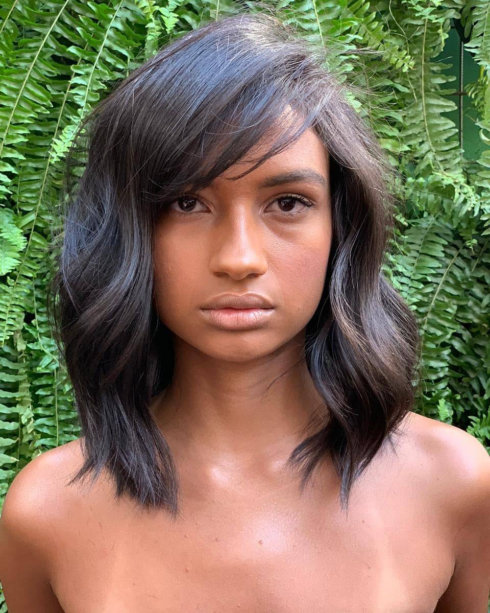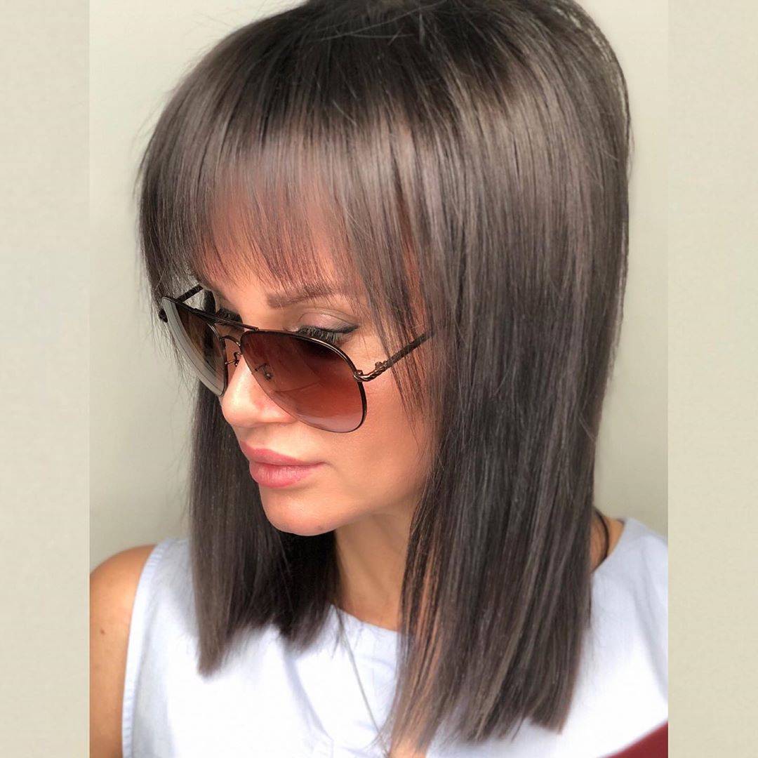 В сочетании с волосами средней длины чёлочка, подходящая к форме лица, всегда смотрится эффектно и стильно, практически вне зависимости от типа волос.