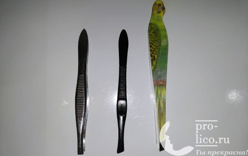 На фото представлены сразу три вида пинцета: с прямым, скошенными и заостренными краями