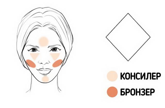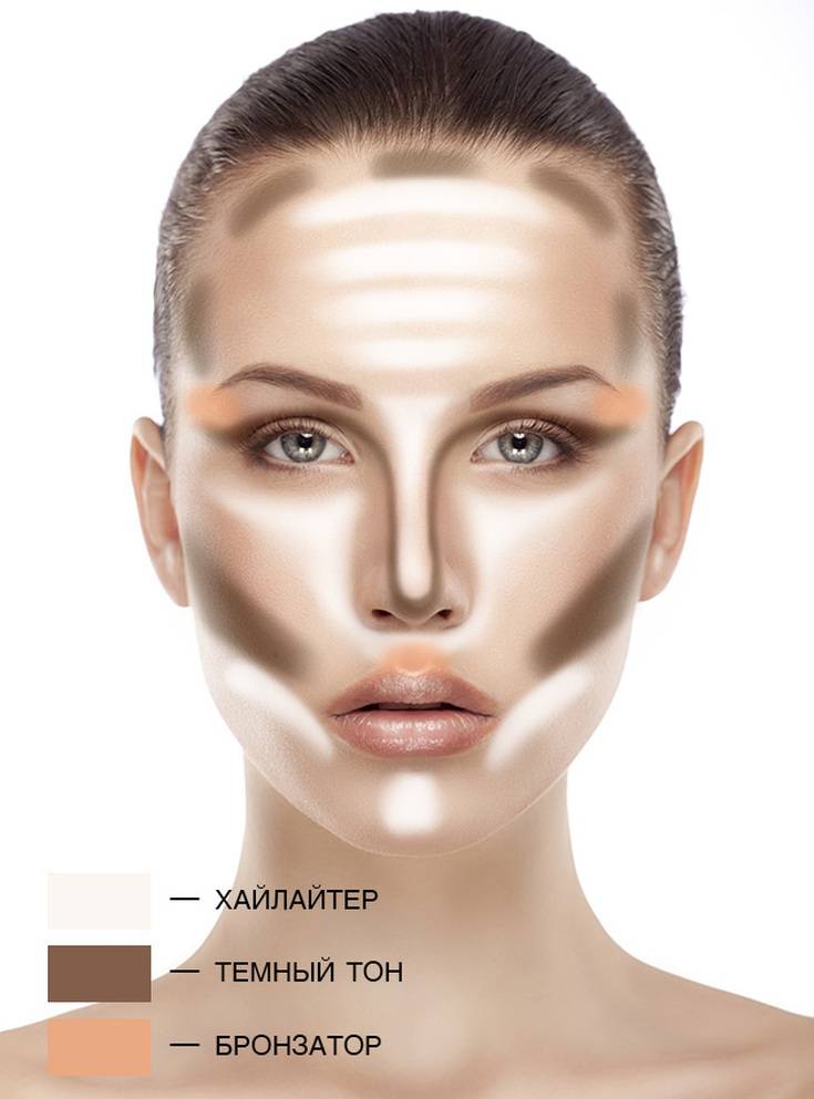 - Сузить круглое лицо можно за счет высветления центральной части лица и затемнения остальных участков кожи.