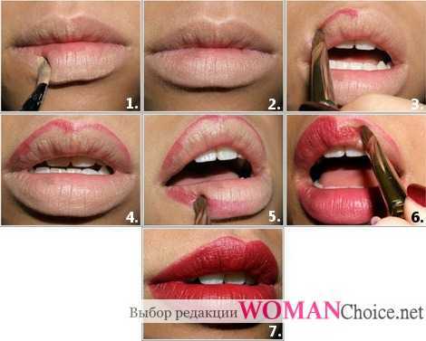 Увеличивает размер губ и использование помады светлых оттенков. Обладательницам узких губ стоит отказаться от темных оттенков помад и четкого контура.