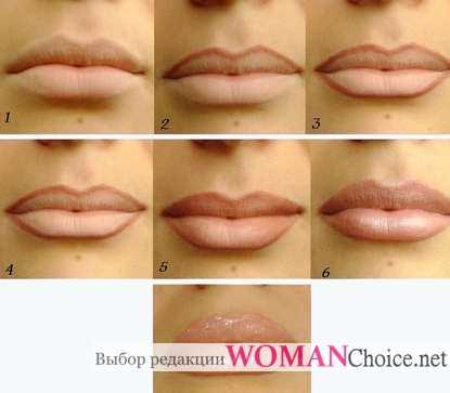 Если подойти упрощенно, то все светлые оттенки помады помогут вам увеличить объем губ, кроме того возможны и более сложные манипуляции с прочерчиванием контура губ. Контур можно прочерчивать либо карандашом, заточенным не слишком остро, его цвет должен быть на два – три тона темнее цвета губ, либо использовать лишь темную помаду.