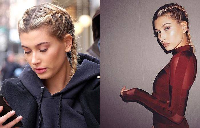 Хейли Болдуин выбирает два колоска не только в качестве практичной прически для повседневности, но и для образа модной фотосессии.