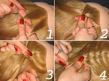 - зафиксированную 4–ю прядь, положить под соседний локон и добавить в нее свободных волос;