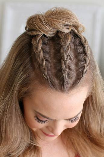- Каждая косичка должна огибать полголовы. На месте встречи плетений можно соорудить небольшой пучок или гульку из обычной косы.