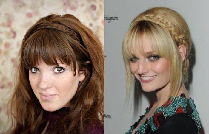 Челка отлично сочетается с заплетенными локонами. Прямая подходит вытянутым и треугольным формам, небрежная, косая, градуированная — идеально скроет несовершенства внешности, корректирует овал. Прическа открывает линию шеи, подчеркивает изящный силуэт.