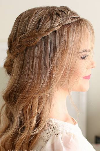 Колосок вокруг головы на длинных, распущенных локонах подходит для особых случаев. Отличная укладка, чтобы подчеркнуть роскошные ниспадающие прядки. Прическа визуально делает выше, стройнее, полусобранные волосы с косой создают образ богини.