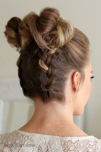 - Такая необычная укладка поразит всех окружающих, её можно украсить разнообразными аксессуарами, взбрызнуть блестящим лаком. Так укладка приобретёт праздничный вид.