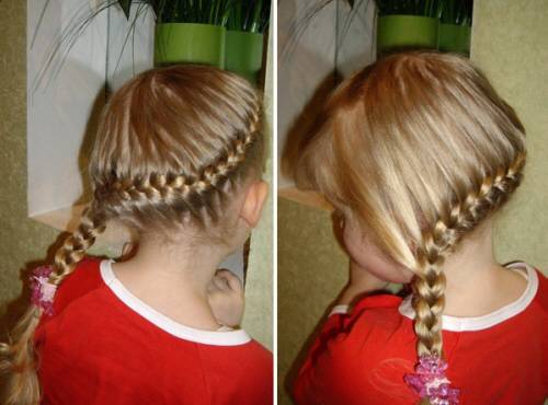 — это обычная косичка, очень популярная среди мамочек. Она называется по-разному: французская коса, дракончик, колосок. Схема плетения довольно простая и понятная.