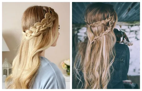 Если волосы длинные, просто уберите их с лица, сделайте начес, а по бокам добавьте косы. Волосы оставляем прямыми или делаем локоны.