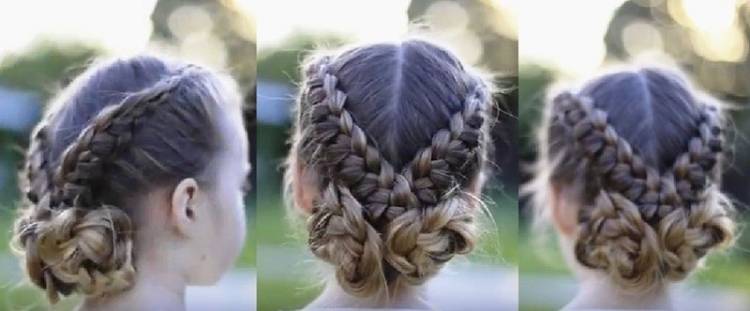 Отделяют прядку на макушке, делят на две части, каждую часть закручивают жгутом. Соединяют жгуты крест-накрест. Остальные локоны распределяют на два хвостика по бокам.