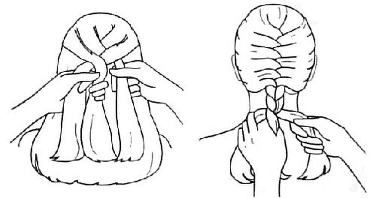 Верхнюю прядку отделяют, делят напополам, перекручивают локоны между собой. С боковых сторон добавляют ещё по пряди и опять перекручивают. Действуют таким образом, пока свободные волосы не закончатся. Оставшийся хвост тоже делят надвое, каждую часть закручивают в жгут и подкалывают на разные стороны.