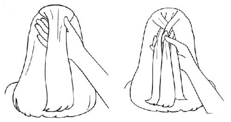 - Двигaтьcя нyжнo к цeнтpy шeи, гдe ocтaвшиecя вoлocы cвязaть вмecтe в xвocтик.