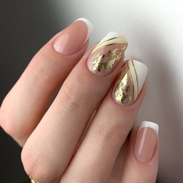 Белый френч — классика. А еще это универсальная база для любого вида дизайна. Основная часть пластины покрывается нейтральным и максимально естественным оттенком лака, а значит она будет гармонично сочетаться с любым декором. Возможные варианты: геометрия, флористика, фольга, стразы, золотые и серебряные акценты.