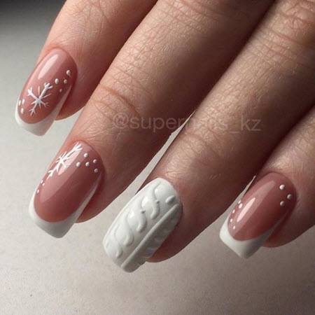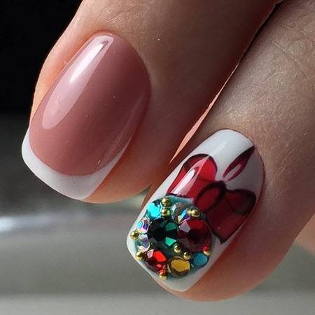 Зимой френч можно украсить снежинками, елочными игрушками и даже новогодними героями. А для любителей более классических вариантов, можно украсить французский маникюр насыщенными блестками и камушками.