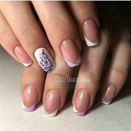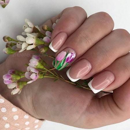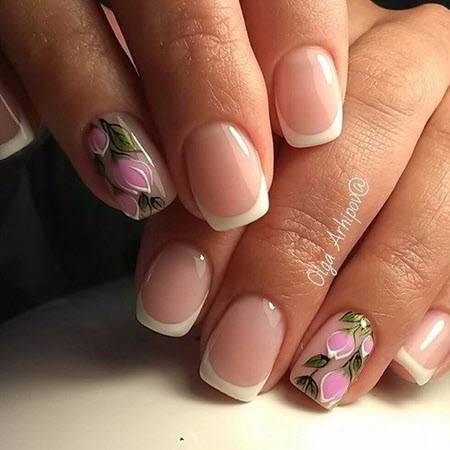 Ногти френч с рисунком выглядят очень привлекательно. С таким маникюром можно щеголять и на празднике, и повседневно: всё зависит от яркости используемого лака и интенсивности нанесённого рисунка. Для торжественных случаев можно сделать рисунок покрупней и поярче, а для повседневного маникюра подойдут рисунки, выполненные лаком более спокойных тонов.