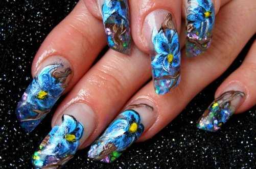 - Изображаем цветы на поверхности ноготков. Взяв тонкую кисточку, дополняем рисунок изящными завитками.