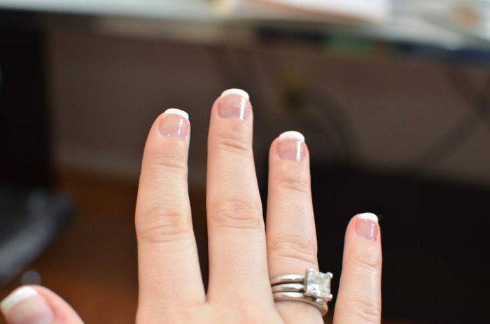 - Подготовка. С помощью маникюрной пилки придайте ногтям одинаковую форму и длину. Наилучший вариант для френча – нежная овальная форма. На квадратных и слишком длинных ногтях френч смотрится неестественно и грубо.
