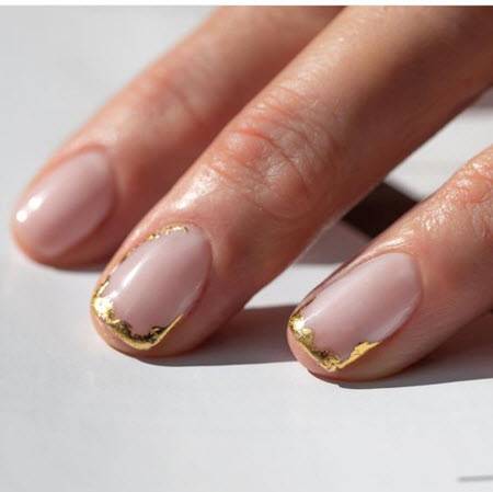 Сусальное золото. Золотистые оттенки отлично подойдут для косого френча, это может быть и металлический блеск фольги, и мелкий глиттер, и крупный шиммер. Красиво смотрится ажурный край, где золотистым лаком выполнены замысловатые орнаменты – работа для настоящего профессионала.