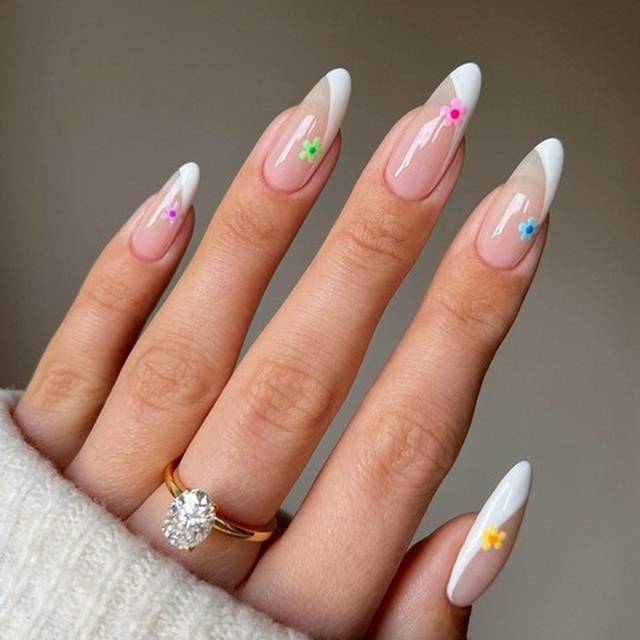 Несмотря на ассиметричность верхней части ногтя, подобные косые ноготки можно украсить при помощи французского маникюра. Лучше создавать классический френч с белой окантовкой ногтя, поскольку он будет смотреться органично с необычной формой самой пластины. Чтобы украсить маникюр и сделать его более ярким, девушка может дорисовать на ногтях небольшие цветы или изображение какого-то животного. Такой маникюр будет выглядеть по-классически сдержанно, несмотря на креативную форму ногтя.