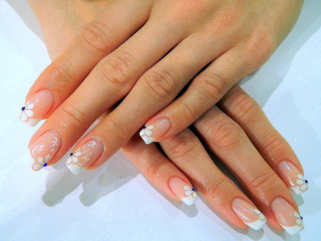 Можно воспользоваться следующей маникюра: сначала делается стандартный френч, после чего он покрывается кружевным рисунком. Такой вид маникюра будет особенно уместен на свадьбе, он выглядит естественно и красиво.