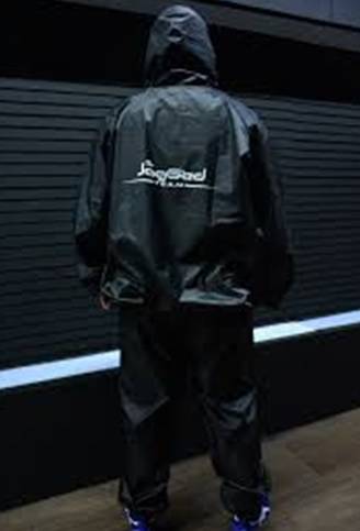 Материалы одежды Jagged — нейлон 100%. Он практически не пропускает воздух. Пользователи, которые уже успели приобрести его, отмечают, что рубашка и брюки позволяют быстро избавиться от лишнего веса. Модель выполнена в традиционном спортивном стиле. Имеются карманы на молнии для мелких вещей, например ключей или телефона. На запястьях и лодыжках есть тугие манжеты. На спине нанесен белый рисунок с логотипом фирмы. Есть капюшон большой глубины на шнуровке. При интенсивной нагрузке и специальном питании, используя данный комплект, можно добиться хороших результатов в корректировке фигуры.