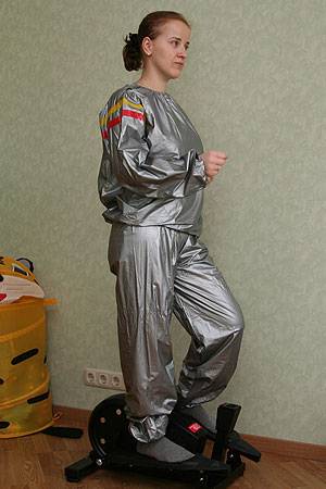 - Поверх белья наденьте комбинезон-сауну или костюмный комплект. Желательно, чтобы он был достаточно свободным, не слишком плотно облегал тело. Это позволит образоваться прослойке воздуха, способствующей отведению тепла от тела.