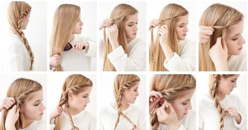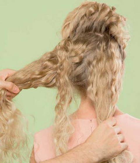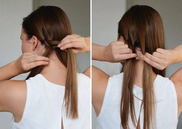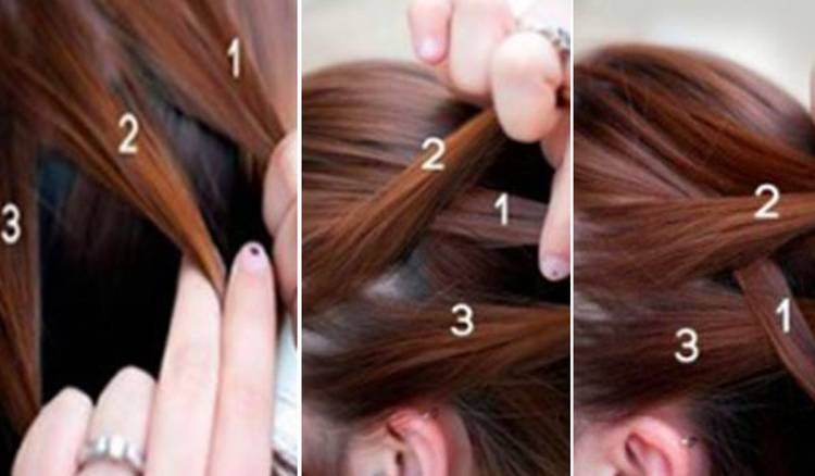 - Уложить левую прядь под расположенную часть посередине, при этом концы волос не должны запутаться между собой.