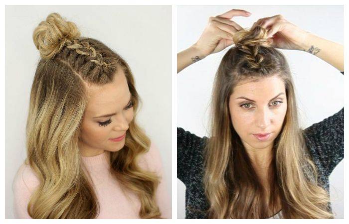 Прически с двумя косами на макушке и распущенными волосами, фото