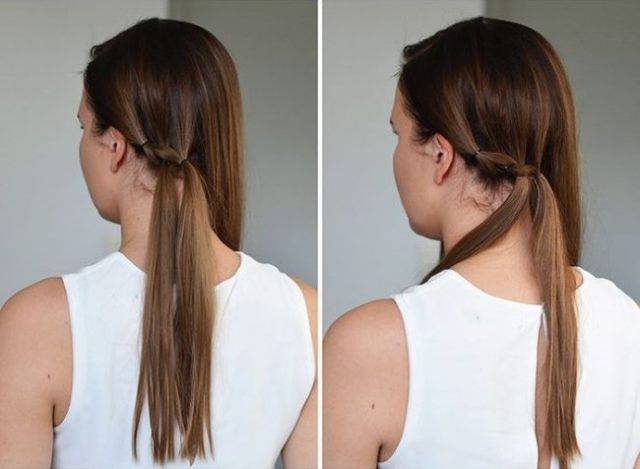 5. Из общей массы волос отделите тонкий локон, соедините его с кончиками предыдущего хвоста и снова свяжите резинкой.