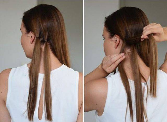 2. Сразу за ухом внизу отделите тонкий локон и завяжите его в хвост. Рядом сделайте еще один точно такой же хвостик.