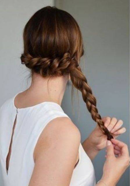 Сделав два звена, начать подхватывать небольшие локоны с боков, перед тем, как переложить боковую прядь через среднюю. Дойдя до уха, начать плести обычную классическую косу, кончик которой скрепить резинкой.