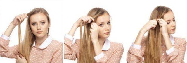 - Взять прядь из свободных волос слева и добавить ее к основной левой пряди.