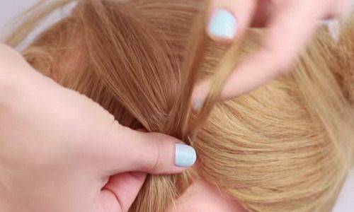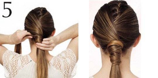 Волосы необходимо расчесать и собрать в средней высоты хвост. Между резинкой и головой делается небольшое отверстие. Конец хвоста продевается в него с помощью петли или рук. Резинка затягивается чуть туже и маскируется волосами.
