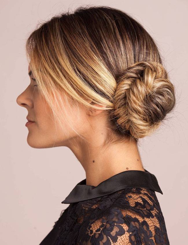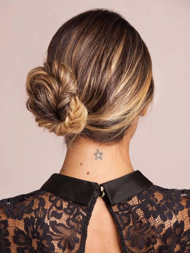 Чтобы сделать классический пучок более интересным, сначала заплетите обычную косу. Затем скрутите его в пучок и прикрепите к голове шпильками. Зафиксируйте лаком для волос, и гламурный пучок готов.