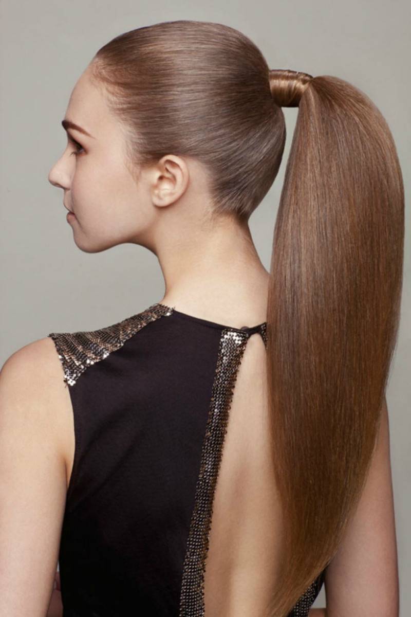 Пряди расчесываются и выпрямляются утюжком. Для добавления визуального объема можно прибегнуть к начесу волос у корней с внутренней стороны. Локоны собираются в высокий хвост с помощью резинки. При этом следует помочь себе руками и расческой для придания прическе гладкости.