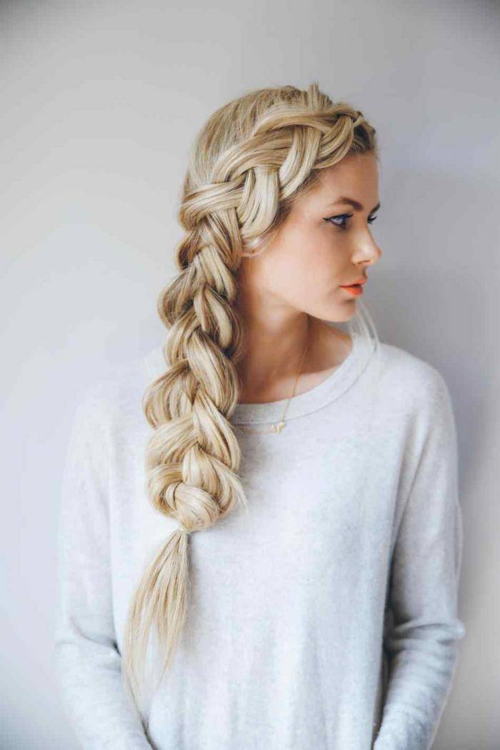 Модный вариант, который появился сравнительно недавно. Плетение осуществляется с помощью четырех прядей, что позволяет получить широкую и плотную структуру.