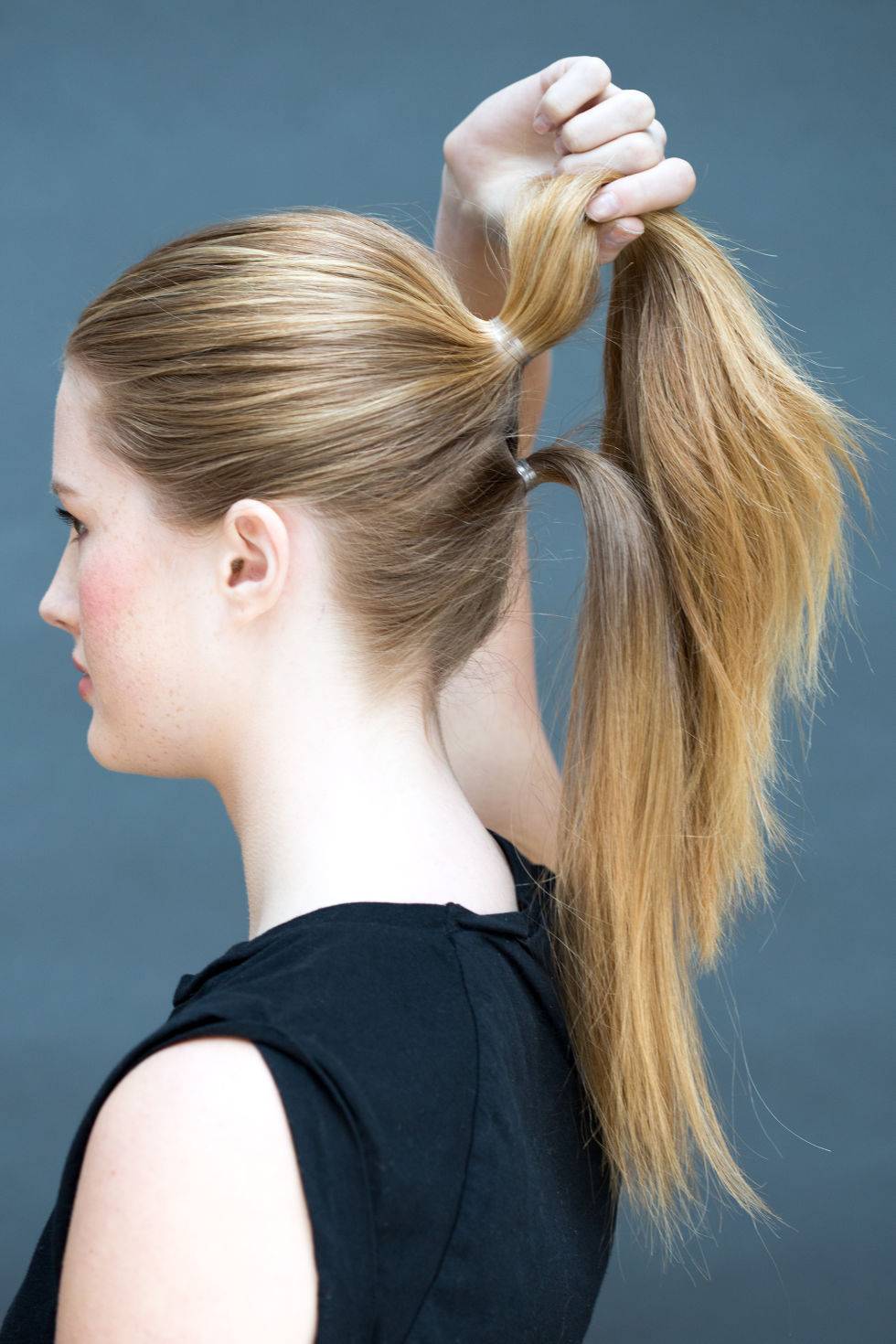 Пряди расчесываются и выпрямляются утюжком. Для добавления визуального объема можно прибегнуть к начесу волос у корней с внутренней стороны. Локоны собираются в высокий хвост с помощью резинки. При этом следует помочь себе руками и расческой для придания прическе гладкости.