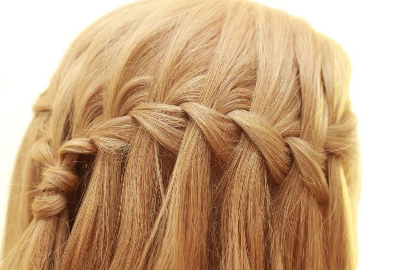 Чтобы реализовать «Водопад» на практике, следует разделить волосы на две неравные части пробором и с одного из боков начать плетение из трех прядей. После того, как несколько «пролетов» будет проплетено по аналогии с «колоском», следует оставлять каждую нижнюю прядь, заменяя ее локонами с верхней части головы. Получившуюся косу следует закрепить заколками в области виска.