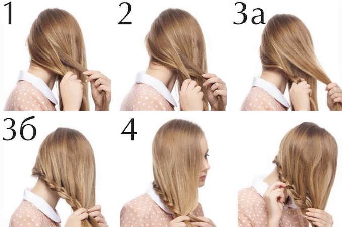 Поэтапная схема плетения прически представлена на фото ниже.