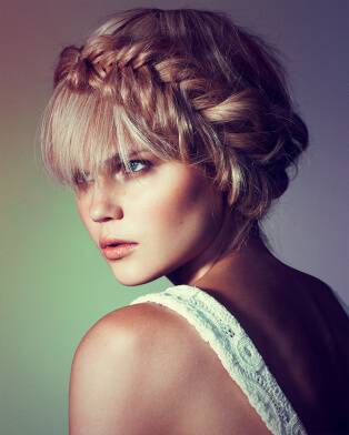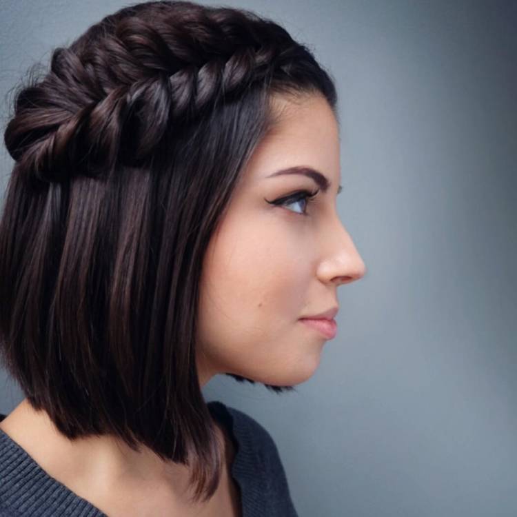 Эта шикарная причёска замечательно выглядит на коротких . Существует несколько вариантов расположения косички в данной укладке: скошенная коса; коса, огибающая голову и косичка, прикрытая прядями волос. Мы предложим вам опробовать первый вариант.