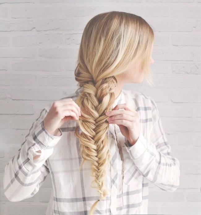 «Рыбий хвост» можно плести из волос, предварительно собранных в пучок, а также начать с затылка по аналогии с «колоском». Главное требование – одинаковая толщина прядей, участвующих в плетении, это позволяет в результате получить симметричную и интересную укладку.